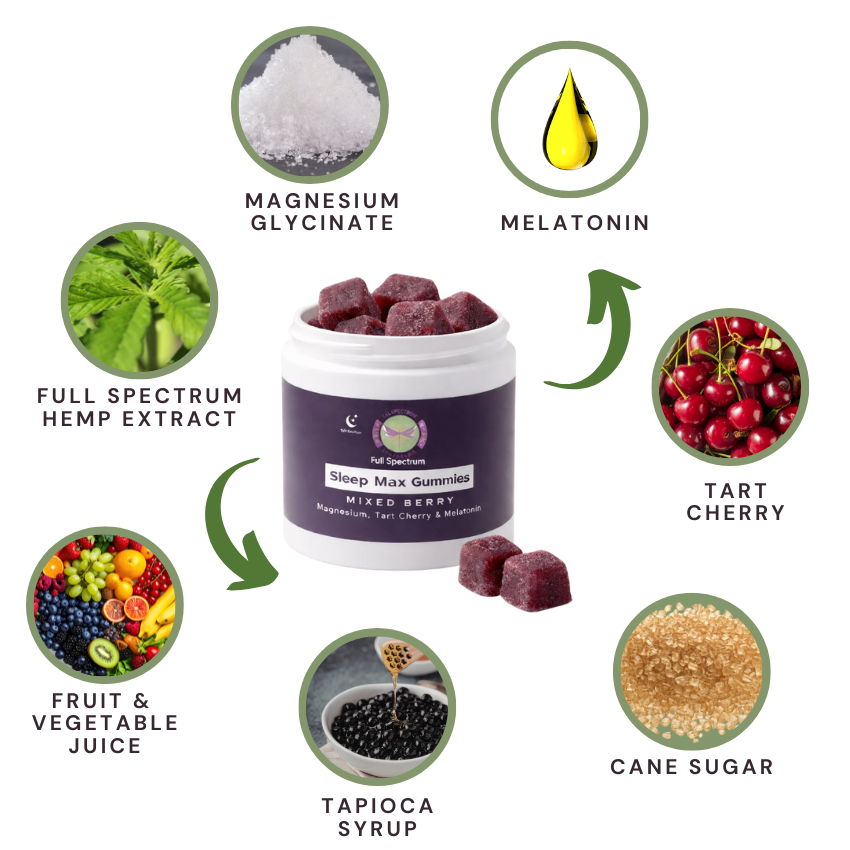 Organic Tapioca Syrup, Organic Cane Sugar, Pectin, Full Spectrum Hemp Extract, Magnesium Glycinate, Organic Tart Cherry Extract, Melatonin, Citric Acid, Natural Flavors, Fruit & Vegetable Juice (for color), Sodium Citrate.